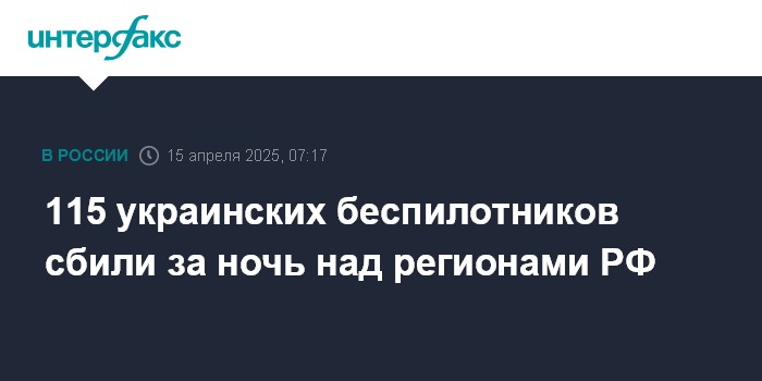 Москва. 15 апреля. INTERFAX.RU - Российские военные сбили 115 дронов ВСУ в ночь на вторник, сообщили в Минобороны РФ.