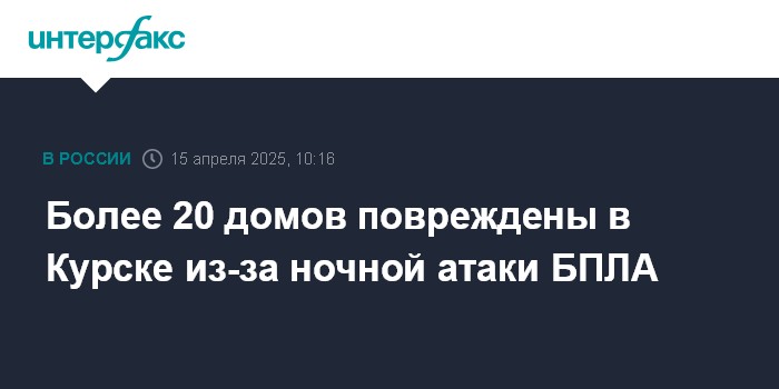 Москва. 15 апреля. INTERFAX.RU - Более 20 многоквартирных домов в Курске получили повреждения во время атаки беспилотников минувшей ночью; из девяти пострадавших шестеро госпитализированы, сообщил врио губернатора Курской области Александр Хинштейн.