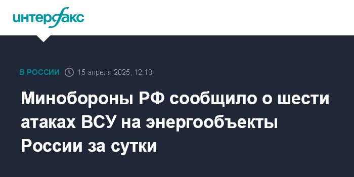Москва. 15 апреля. INTERFAX.RU - Украина в течение суток шесть раз атаковала российские энергетические объекты в Брянской, Курской и Херсонской областях, сообщили в Минобороны РФ во вторник.