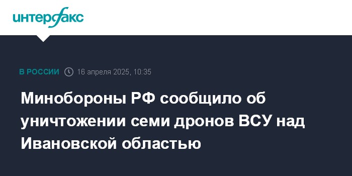 Москва. 16 апреля. INTERFAX.RU - Российские военные в среду в период с 8:00 до 9:40 сбили семь украинских беспилотников в небе над Ивановской областью, сообщили в Минобороны РФ.
