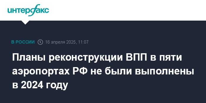 Москва. 16 апреля. INTERFAX.RU - Реконструкция пяти взлетно-посадочных полос (ВПП) в РФ не была завершена в 2024 году, как это предусматривалось планами Минтранса.