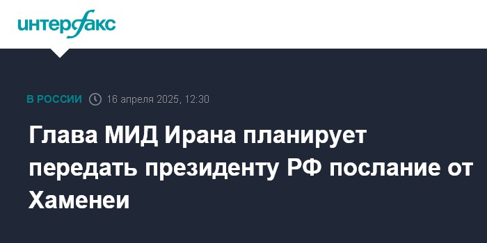 Москва. 16 апреля. INTERFAX.RU - Глава МИД Ирана Аббас Аракчи в среду заявил, что намерен передать в ходе визита в Россию послание от верховного лидера Ирана аятоллы Али Хаменеи российскому президенту Владимиру Путину.