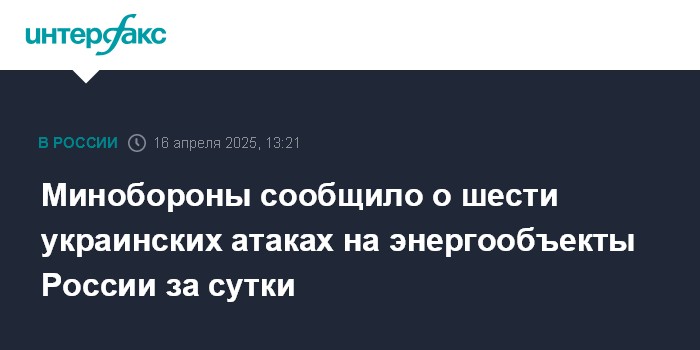 Москва. 16 апреля. INTERFAX.RU - Вооруженные силы Украины в течение суток нанесли шесть ударов по объектам российской энергетической инфраструктуры, атаки зафиксированы в четырех областях России, сообщили в Минобороны РФ в среду.