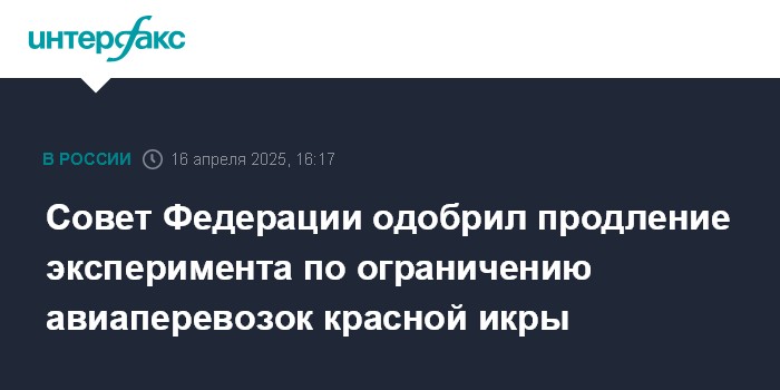Москва. 16 апреля. INTERFAX.RU - Совет Федерации одобрил закон, который продлевает до 1 августа 2027 года эксперимент по ограничению внутренних воздушных перевозок красной икры непромышленного изготовления на Камчатке. Также документ включает в эксперимент Чукотку и Хабаровский край.
