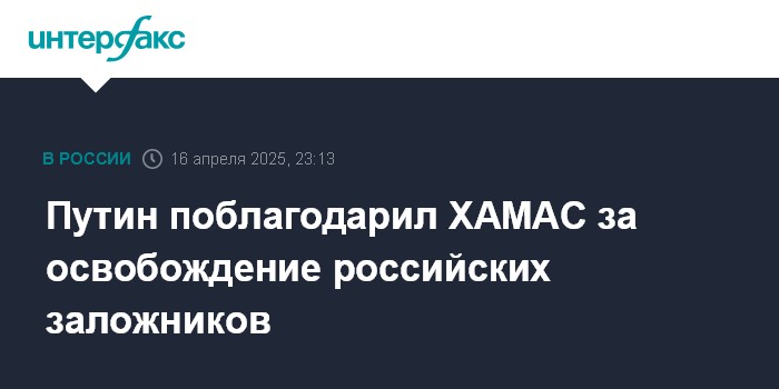 Москва. 16 апреля. INTERFAX.RU - Президент РФ Владимир Путин выразил благодарность руководству и политическому крылу группировки ХАМАС за освобождение российских заложников в секторе Газа.