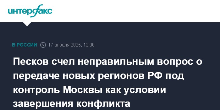 Песков счел неправильным вопрос о передаче новых регионов РФ под контроль Москвы как условии завершения конфликта