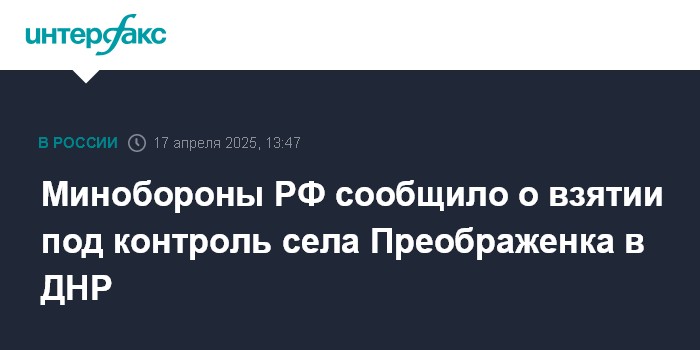 Минобороны РФ сообщило о взятии под контроль села Преображенка в ДНР