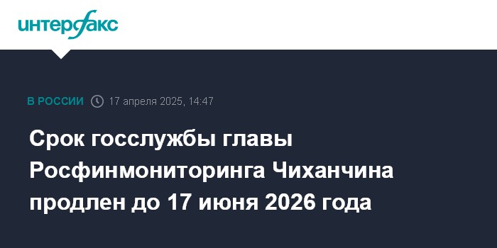 Москва. 17 апреля. INTERFAX.RU - Президент Владимир Путин продлил до 17 июня 2026 года срок пребывания на федеральной государственной гражданской службе главе Росфинмониторинга Юрию Чиханчину.