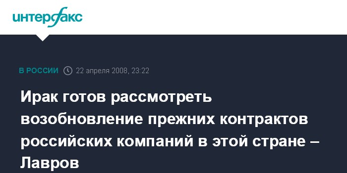 Москва. 22 апреля. ИНТЕРФАКС - Ирак готов рассмотреть возобновление прежних контрактов российских компаний в этой стране, заявил глава МИД РФ Сергей Лавров.