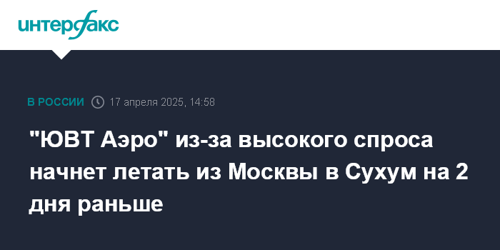 Ранее сообщалось, что свой первый регулярный рейс из Москвы в Сухум "ЮВТ Аэро" выполнит 3 мая. Авиакомпания будет летать в Сухум и обратно в Москву по субботам на 50-местных Bombardier CRJ-200.