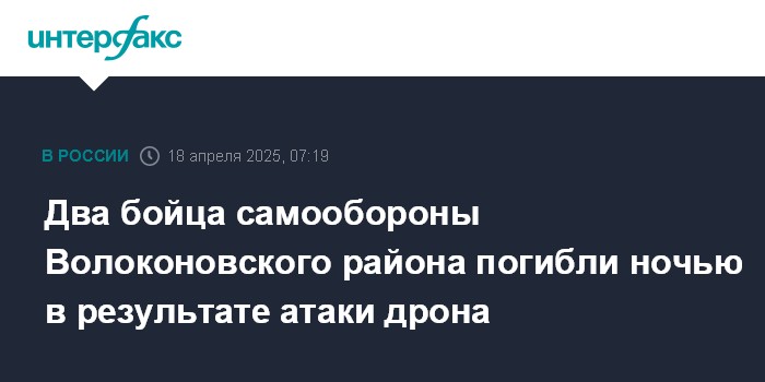 Москва. 18 апреля. INTERFAX.RU - Губернатор Белгородской области Вячеслав Гладков сообщил, что ночью из-за атаки украинского беспилотника погибли два бойца самообороны Волоконовского района.