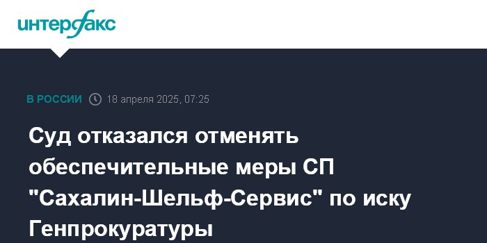 Москва. 18 апреля. INTERFAX.RU - Арбитражный суд Сахалинской области не удовлетворил заявление СП ООО "Сахалин-Шельф-Сервис" (работает на углеводородных шельфовых проектах Сахалина и Камчатки) об отмене обеспечительных мер в рамках иска Генпрокуратуры РФ о выводе из-под управления государства доли в этом СП, говорится в картотеке арбитражных дел.
