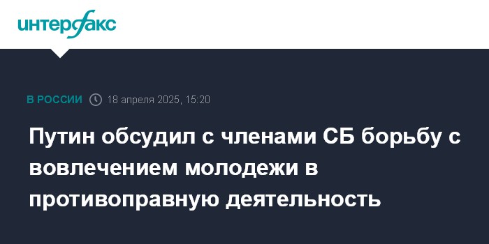 Москва. 18 апреля. INTERFAX.RU - Президент РФ Владимир Путин на совещании с постоянными членами Совбеза РФ рассмотрел вопрос о противодействии попыткам вовлечения несовершеннолетних и молодежи в противоправную деятельность.