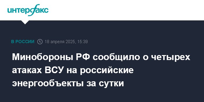 Москва. 18 апреля. INTERFAX.RU - Вооружённые силы Украины за минувшие сутки четыре раза атаковали объекты российской энергетики, сообщает министерство обороны РФ в пятницу.