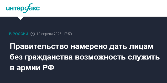 Москва. 18 апреля. INTERFAX.RU - Правительство внесло в Госдуму законопроект, предоставляющий право лицам без гражданства вступить в Вооруженные силы РФ.