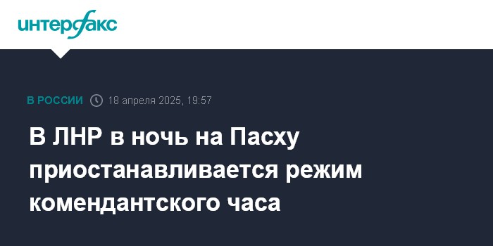 Москва. 18 апреля. INTERFAX.RU - Глава Луганской народной республики Леонид Пасечник приостановил действие режима комендантского часа на большинстве территории ЛНР в ночь на Пасху, сообщается в телеграм-канале руководителя региона.