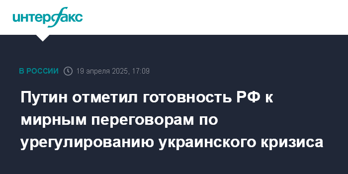 Москва. 19 апреля. INTERFAX.RU - Россия готова к мирным переговорам и приветствует усилия США, направленные на мирное урегулирование украинского кризиса, благодарна за соответствующие усилия Китаю и странам БРИКС, заявил президент РФ Владимир Путин в субботу.