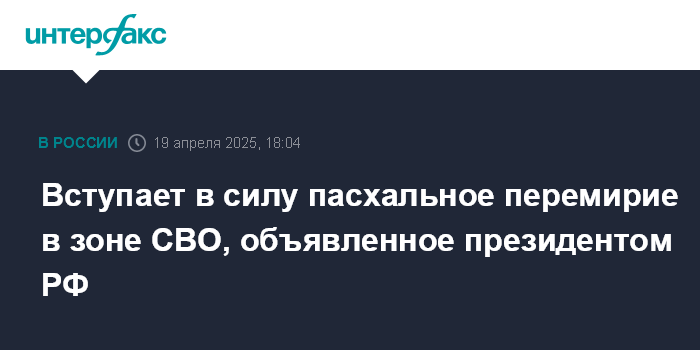 Москва. 19 апреля. INTERFAX.RU - Режим прекращении огня российскими военными в зоне СВО вступает в силу с 18:00 субботы, как ожидается, он продлится до 00:00 21 апреля.