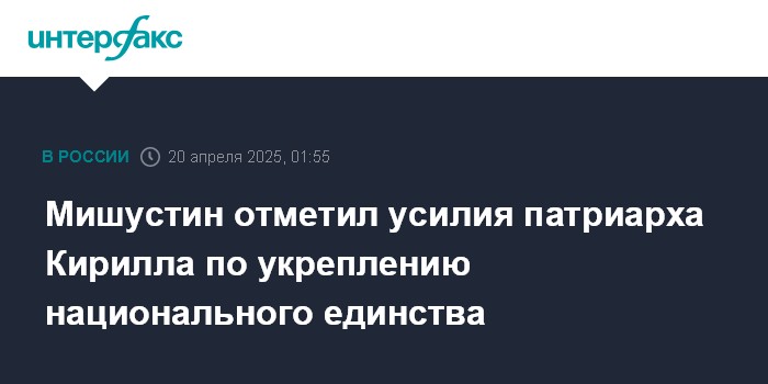Москва. 20 апреля. INTERFAX.RU - Премьер РФ Михаил Мишустин поздравил патриарха Московского и всея Руси Кирилла с праздником Пасхи, отметив его усилия, направленные на укрепление национального единства.