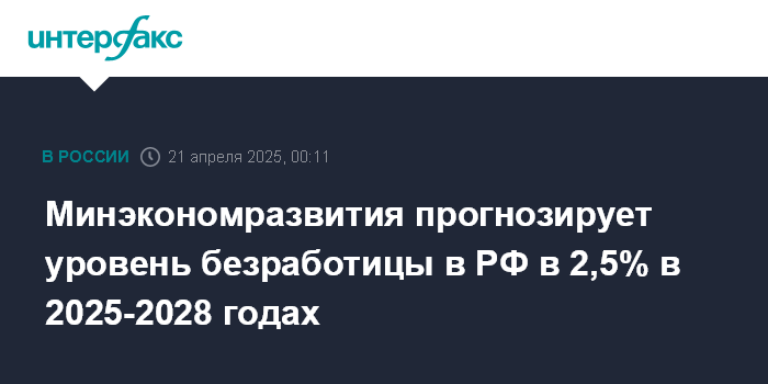 Москва. 21 апреля. INTERFAX.RU - Минэкономразвития РФ прогнозирует сохранение минимальных уровней безработицы в РФ в 2,5% на всем прогнозном горизонте 2025-2028 годов, сообщил журналистам представитель министерства.