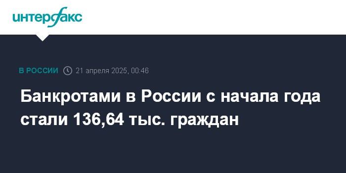 Москва. 21 апреля. INTERFAX.RU - Статус банкрота через суд в первые три месяца 2025 года получили 120 993 граждан, в рамках внесудебной процедуры через "Многофункциональные центры" (МФЦ) - 15 646 граждан, что соответственно на 34,8% и 24% больше, чем за аналогичный период годом ранее, свидетельствуют данные "Федресурса" (Единый федеральный реестр сведений о банкротстве, fedresurs.ru).