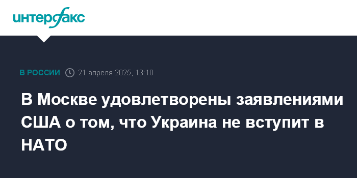 Москва. 21 апреля. INTERFAX.RU - Заявления Вашингтона о том, что Украина не вступит в НАТО, совпадают с российской позицией и вызывают удовлетворение Москвы, заявил пресс-секретарь президента РФ Дмитрий Песков.