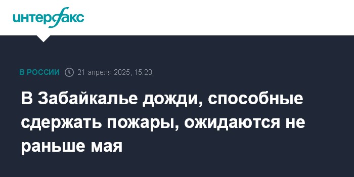 Москва. 21 апреля. INTERFAX.RU - В Забайкальском крае осадки, способные снизить напряженность обстановки с природными пожарами, ожидаются только в первых числах мая, сообщает региональное правительство со ссылкой на прогнозы Гидрометцентра.