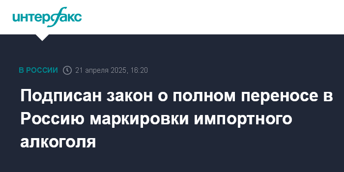 Москва. 21 апреля. INTERFAX.RU - Президент Владимир Путин подписал закон о полном переносе с 1 марта 2026 года маркировки импортной алкогольной продукции на территорию России, что должно упростить процедуру ввоза и контроля качества, сообщается на официальном интернет-портале правовой информации.