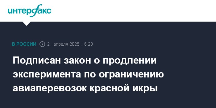 Москва. 21 апреля. INTERFAX.RU - Президент РФ Владимир Путин подписал закон, который продлевает до 1 августа 2027 года срок действия эксперимента по ограничению внутренних воздушных перевозок красной икры непромышленного изготовления на Камчатке. Об этом сообщается на официальном интернет-портале правовой информации. Также документ включает в эксперимент Чукотку и Хабаровский край.