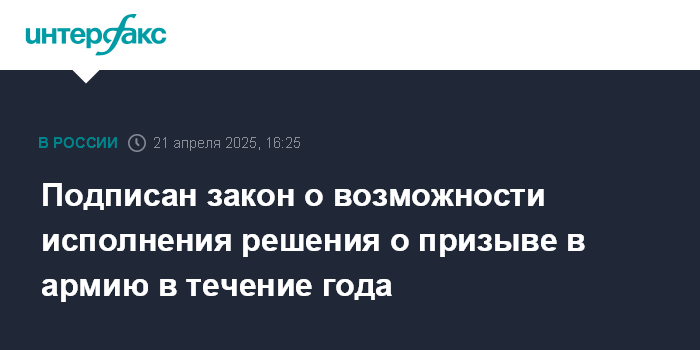 Москва. 21 апреля. INTERFAX.RU - Президент Владимир Путин подписал закон о возможности исполнения в течение года решения о призыве на военную службу.