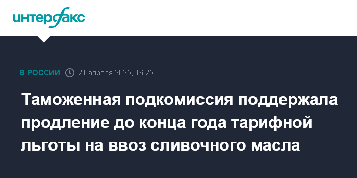 Москва. 21 апреля. INTERFAX.RU - Подкомиссия по таможенно-тарифному и нетарифному регулированию правкомиссии по экономическому развитию и интеграции поддержала продление на период с 16 июня по 31 декабря 2025 года действующей тарифной льготы на ввоз в РФ 25 тыс. тонн сливочного масла, говорится в сообщении секретариата вице-премьера Александра Новака.