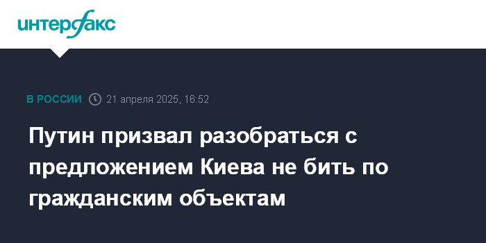 Москва. 21 апреля. INTERFAX.RU - Президент РФ Владимир Путин заявил, что с предложением украинской стороны о ненанесении ударов по гражданским объектам необходимо разобраться, все будет проанализировано.