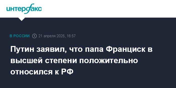 Москва. 21 апреля. INTERFAX.RU - Папа римский Франциск, ушедший из жизни в понедельник, относился к России в высшей степени положительно, и россияне это будут помнить, заявил журналистам президент РФ Владимир Путин.
