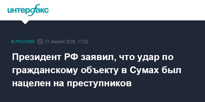 Москва. 21 апреля. INTERFAX.RU - Президент Владимир Путин прокомментировал удар российских военных по гражданскому объекту в Сумах, отметив, что там находились преступники, которые получили заслуженное возмездие.