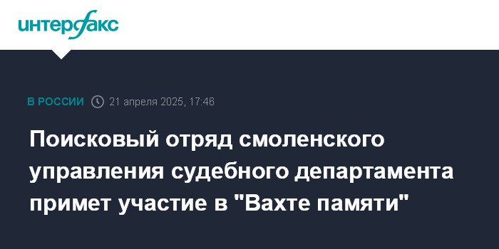 Москва. 21 апреля. INTERFAX.RU - Поисковый отряд "Меркурий", созданный работниками Управления Судебного департамента в Смоленской области, примет участие в Международной "Вахте Памяти".