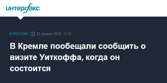 Москва. 22 апреля. INTERFAX.RU - В Кремле проинформируют о визите в РФ спецпосланника США по Ближнему Востоку Стива Уиткоффа, когда он состоится, сообщил пресс-секретарь президента РФ Дмитрий Песков.
