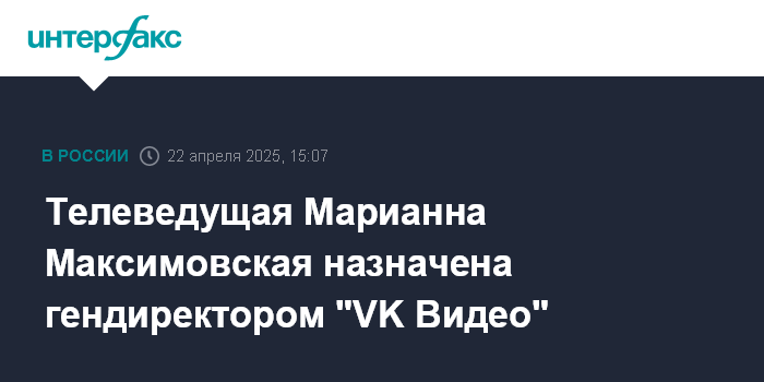 Москва. 22 апреля. INTERFAX.RU - Генеральным директором "VK Видео" назначена известная телеведущая Марианна Максимовская, говорится в сообщении VK.