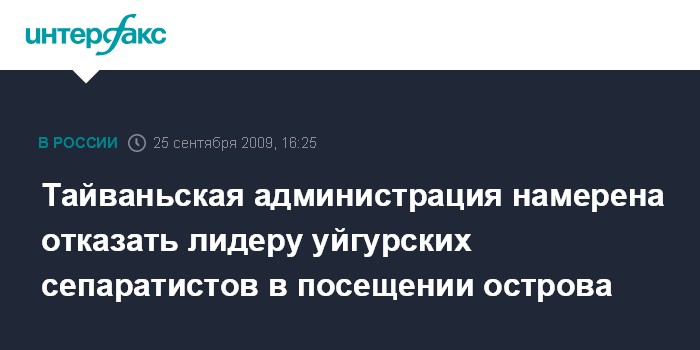 Москва. 25 сентября. INTERFAX.RU - Администрация Тайваня не допустит визита главы Всемирного уйгурского конгресса на остров, сообщили китайские СМИ со ссылкой на заявление представителей тайваньских властей. "Мы приняли решение не допустить визита Рабии Кадир, с учетом того, что ее поездка может оказать влияние на государственные интересы и общественный порядок", - заявил представитель тайваньской администрации.