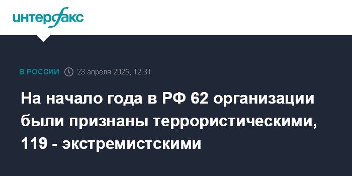 Москва. 23 апреля. INTERFAX.RU - В России на начало 2025 года 62 организации признаны террористическими и 119 экстремистскими, сообщил судья Верховного суда России Александр Воронов на совещании председателей Верховных судов государств-членов Шанхайской организации сотрудничества. Его цитирует пресс-служба ВС России.