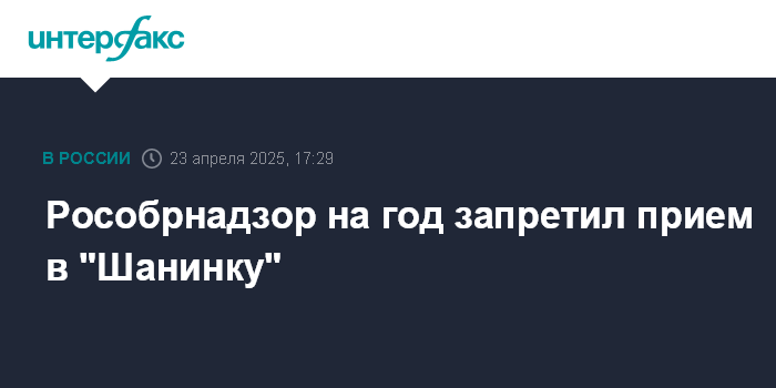 Москва. 23 апреля. INTERFAX.RU - Рособрнадзор запретил прием на обучение в Московскую высшую школу социальных и экономических наук ("Шанинка") на год из-за неисполнения предписания об устранении выявленных в ноябре 2024 года нарушений, сообщили "Интерфаксу" в пресс-службе ведомства.
