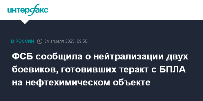 Москва. 24 апреля. INTERFAX.RU - ФСБ сообщила, что в Нижегородской области в ходе боя были ликвидированы двое уроженцев Средней Азии, готовивших теракт с использованием БПЛА по заданию украинского куратора.