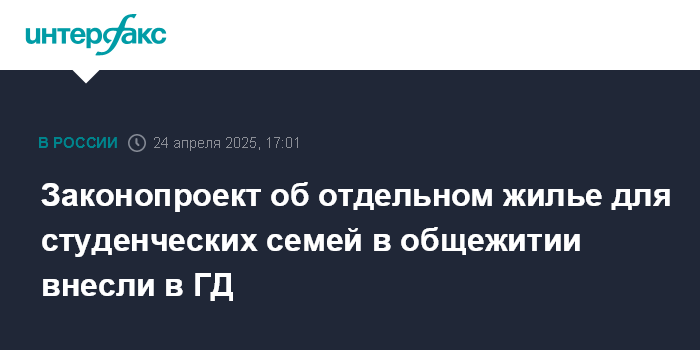 Москва. 24 апреля. INTERFAX.RU - Группа депутатов внесла в Госдуму законопроект № 902651-8 о новых правилах распределения мест в студенческих общежитиях, который предусматривает в том числе создание в общежитиях семейных блоков.