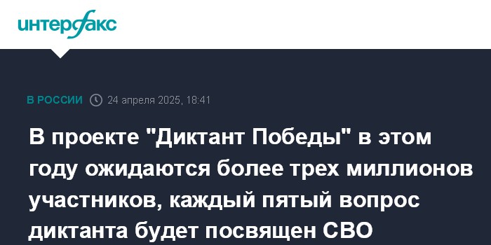 В проекте "Диктант Победы" в этом году ожидаются более трех миллионов участников, каждый пятый вопрос диктанта будет посвящен СВО