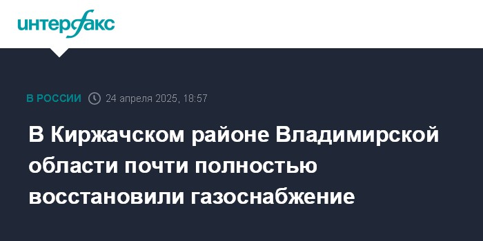 Москва. 24 апреля. INTERFAX.RU - Губернатор Владимирской области Александр Авдеев сообщил о восстановлении газоснабжения в большинстве населенных пунктов Киржачского района, где его отключали из-за взрывов боеприпасов в воинской части.