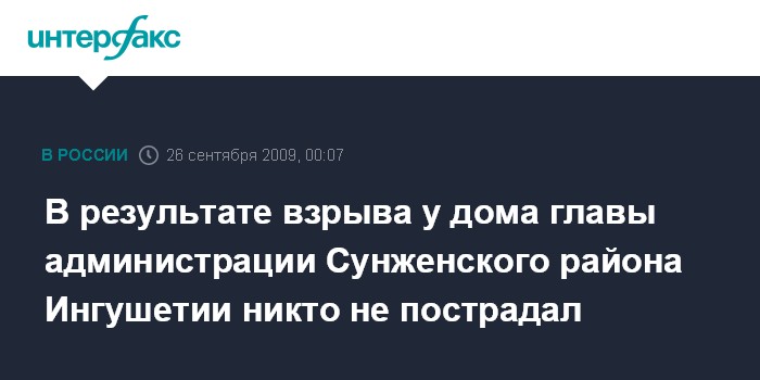 "Примерно в 23:20 мск у дома главы администрации произошел взрыв неустановленного взрывного устройства, в результате которого жертв и пострадавших нет, при этом домовладению причинен незначительный ущерб", - сообщил агентству "Интерфакс-юг" представитель МВД Ингушетии.