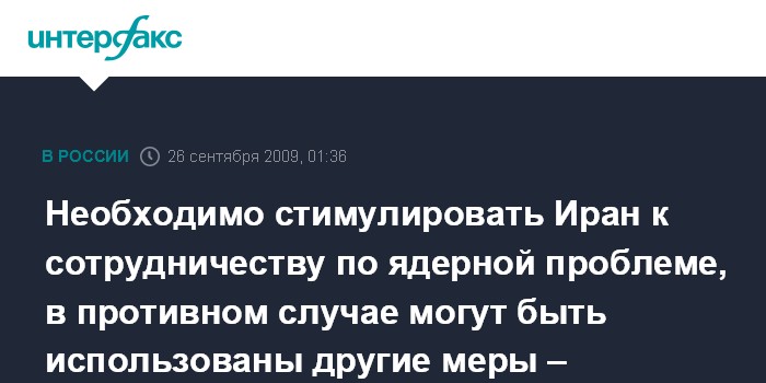 Питтсбург. 26 сентября. ИНТЕРФАКС - Президент России Дмитрий Медведев призывает международное сообщество стимулировать Иран к сотрудничеству по поводу его ядерной программы.