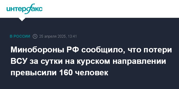 Москва. 25 апреля. INTERFAX.RU - Вооружённые силы Украины в течение суток потеряли на курском направлении свыше 160 военнослужащих, общие потери противника за время боевых действий здесь превысили 75 870 человек, сообщило министерство обороны РФ в пятницу.