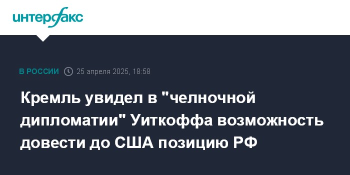 Москва. 25 апреля. INTERFAX.RU - Личные встречи президента РФ Владимира Путина со спецпосланником президента США Стивом Уиткоффом являются хорошей возможностью донести позицию России, такой формат позволяет изложить все нюансы, заявил пресс-секретарь главы российского государства Дмитрий Песков.