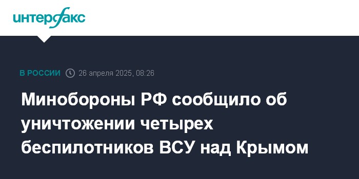 Москва. 26 апреля. INTERFAX.RU - Российские военные сбили утром в субботу четыре украинских беспилотника над Крымом, заявили в Минобороны РФ.