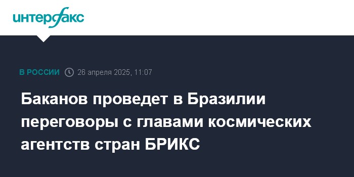 "С 27 по 29 апреля 2025 года генеральный директор госкорпорации "Роскосмос" Дмитрий Баканов примет участие во встрече глав космических агентств стран БРИКС, которая пройдет в Бразилии", - говорится в сообщении.